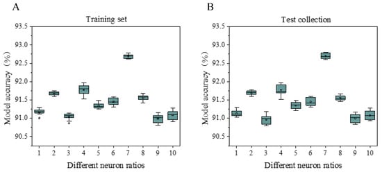 Model accuracy rate at different neuron ratios. Figure (A) shows the accuracy of the model under different neuron ratios on the training set; Figure (B) shows the accuracy of the model under different neuron ratios on the test set.