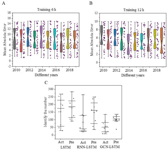 Model stability test results. Figure (A,B) illustrate the mean absolute errors of the GCN-LSTM model after 6 h and 12 h training on the data of 2010–2019, respectively. Figure (C) shows the identified and predicted number of typhoons of LSTM, RNN-LSTM, and GCN-LSTM models.