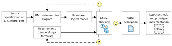 The highlights of the paper can be shortly summarized as follows: (a) a UML state-based specification of the control scheme of a CPS is given, (b) the detailed algorithms of rule-based model generation are provided, (c) the method of how to establish an abstract rule-based logical model is explained, (d) the specification is formally verified and then a prototype implementation in an FPGA device can be performed and (e) the case study illustrates the proposed method.