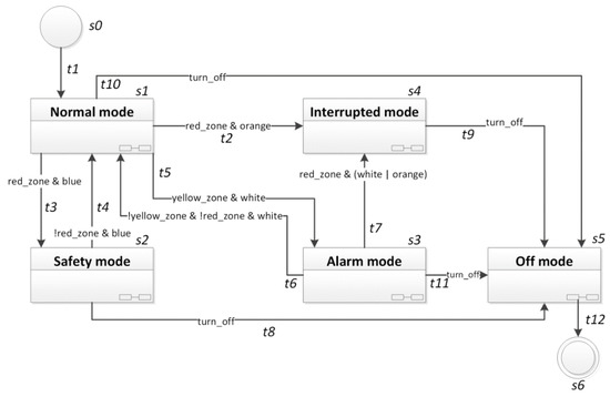 Control processes are already well described in the literature. There are various specification techniques of control processes [10], including Petri nets (PN) [11,12,13], statecharts [14] and diagrams of the Unified Modelling Language (UML) [15,16]. There are also some approaches to using these specification techniques in the domain of cyber-physical systems, such as [17,18,19,20,21,22,23]. Each specification technique has its advantages and disadvantages. Petri nets, as a mathematical model, has the wide support of analysis and verification methods [12,24,25]. Statecharts [14] were introduced as a state-based representation of a reactive system. UML diagrams in turn, are simpler, more user-friendly and more frequently used in the industry. The use of UML improves the information flow between team members and provides better understanding of system behavior. Moreover, some of the verification techniques are also applicable, including, e.g., simple model checking of activity diagrams [26] or state machine diagrams [27].