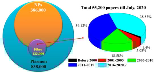 Using “Plasmon,” “Plasmon nanoparticles,” and “Plasmon nanoparticles fiber” as the keywords in Google Scholar, the corresponding number of published papers was compared in Figure 1. Among the reported plasma related articles, 46% were related to NPs. The work on metal NPs modified fiber SPR has been reported since 2000, and almost all the articles (98.6%) have appeared in the last decade.