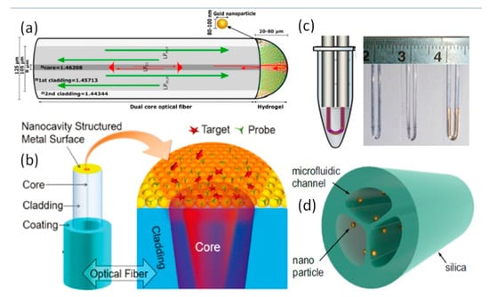 Metal NPs elaborated (a) fiber end using dip-coating []; (b) fiber end using self-assembly method []; (c) U-shaped fiber [] and (d) air hole of PCF [].