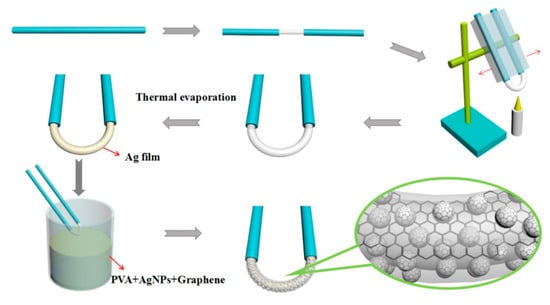 Jiang has put forward a relatively perfect design scheme of metal NPs optical fiber SPR sensing probe very early [], which was improved and optimized in many similar works. The fabrication process is indicated in Figure 4.