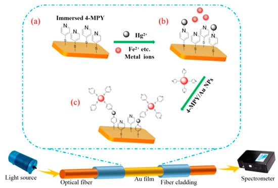 Different chemical groups or biomolecules are used as indicators of heavy metal ions, which can effectively improve the selectivity of the corresponding sensors. The -COOH group can interact with Pb2+ ions other than As2+, Cd2+, and Hg2+ to change the refractive index and dielectric constant of Au NPs, as well as the intensity of its SPR spectrum []. Many bioactive molecules are used as indicators of heavy metal ions. Fluorescence, electrochemistry, and colorimeter methods have been used to develop heavy metal ion sensors. “thymine-Hg2+-thymine base pair mismatches” mechanism was illustrated in a DNA-Au NPs based fiber sensor []. The improved LOD was contributed to both refractive index increase (around the Au NPs) and near field coupling enhancement (among Au NPs and DNA conjunction). Bovine serum albumin (BSA)-chitosan modified by Au NPs was coated on the surface of U-shaped optical fiber and was verified by experiments to measure Hg2+ in tap water, sewage, and soil with a LOD of 0.1 ppb, and the good selectivity []. A wild typed bacteria E. coli B40 being as the negatively charged cells were equipped on a PAH/PSS@Au NPs probe and used as the receptor of Hg2+ and Cd2+ []. Its selectivity for Hg2+ and Cd2+ is significantly higher than that of other ions (K+, Na+, Cu2+, Zn2+, Co2+, Ni2+, and Mn2+). 4-Mpy can not only be bonded to Au NPs closely but also selectively capture pyridine Hg2+ in water through nitrogen [], as shown in Figure 5.