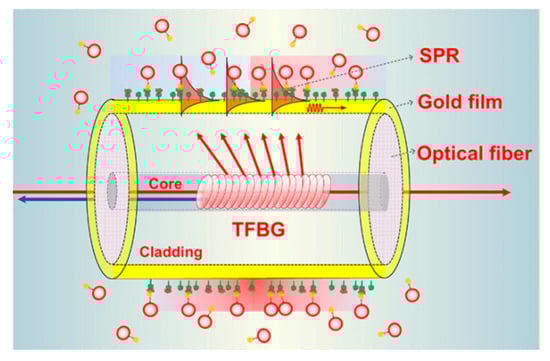 For fiber structures with a single resonant peak, such as reflected light of FBG or transmission light of LPG, the ultra-high sensitivity can be obtained when the wavelength of the most resonant peak moves due to the sudden change of light intensity near the peak inflection point []. Optical signals can also be reflected to the sensing area through some special optical fiber structures and interact with the environment to be measured. TFBG has been used to effectively control the output direction of the optical signal, and its core mode has the adjustment function of temperature cross sensitive, as shown in Figure 6 [].