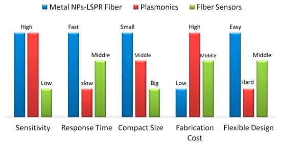 The properties for metal NPs based LSPR fiber sensors have been compared with those of plasmonics devices and fiber sensors in Figure 7.