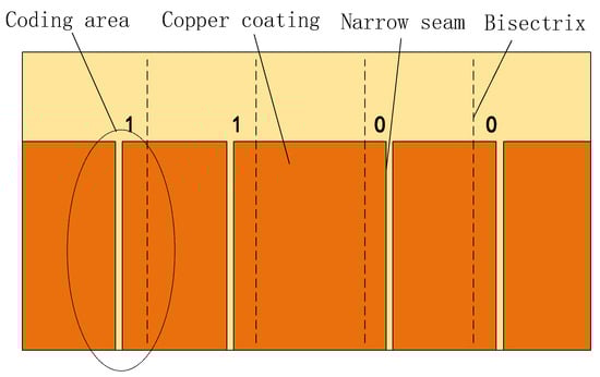 At present, the absolute positioning method based on electromagnetic induction is adopted for high-speed maglev train. Its working principle is to scan the passive position marker plate (hereinafter referred to as the marker plate) along the track through the onboard absolute positioning sensor, so as to obtain the position information [,,]. The position code on the marker plate is realized by special treatment on the copper coating of the marker plate. Each marker plate has a four-bit binary code, and the position of the narrow seam relative to the five-bisector of the marker plate indicates that the bit code is 1 or 0. As shown in Figure 1, the code is 1100.