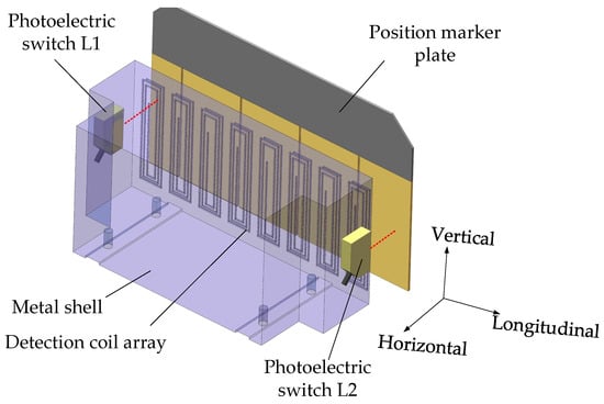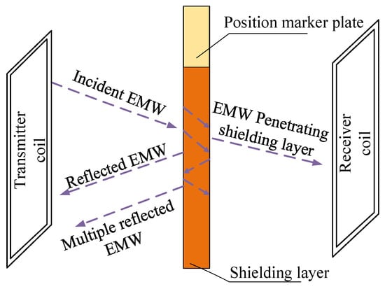 The copper layer of the marker plate can shield the magnetic field. Copper has a high conductivity, and the high-frequency magnetic field can be offset by the eddy current reverse magnetic field generated by the copper coating [,]. As shown in Figure 2, the electromagnetic wave (EMW) emitted by transmitter coil passes through the copper coating layer, the copper coating layer will absorb part of the electromagnetic wave, and the remaining electromagnetic wave will penetrate the shielding layer and be received by receiver coil. As the absolute positioning sensor currently used in high-speed maglev train, INK (the sensor was first developed by Germany, so the German name INK is still used in the field of maglev, which is the abbreviation of INKREFA_Messeinheit in German) uses the transmission detection principle, and adopts symmetrical transmitter coil and receiver coil to transmit and detect electromagnetic wave respectively. In the narrow seam of the marker plate, the incomplete copper coating leads to more electromagnetic wave transmission. Accordingly, the sensor will receive more electromagnetic waves at the seam, so as to identify the seam and read the position code of the marker plate [,].