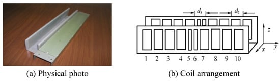 INK adopts the transmission detection principle, and its structure is U-shaped, as shown in Figure 3a. In Figure 3b, the transmitter coil and receiver coil of the sensor are arranged symmetrically on both sides [,], with a total of 10 groups. Eight groups of wide coils are used as positioning coils (1–4 and 7–10 in Figure 3), and two groups of narrow coils (5 and 6 in Figure 3) are code-reading coils, which are used to read the address code of the marker plate. Positioning error refers to that the detection coil deviates from the ideal reading position. Constrained by the dynamic response of the positioning coil, the positioning error is large in high-speed detection, which is easy to lead to code-reading error. Therefore, the code-reading value is generally determined by comparing the terminal voltage of two code-reading coils.