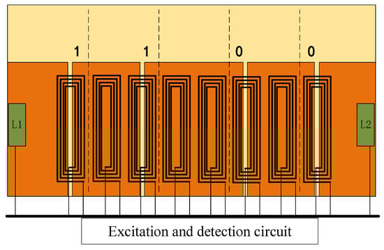 In view of the shortcomings of INK, this paper proposes an absolute positioning sensor NINK based on eddy current reflection. NINK utilizes the principle of eddy current reflection, and the detection coil can both receive and emit electromagnetic waves. So only one surface of NINK is the detection surface, as shown in Figure 4b. Different from the U-shaped structure, NINK has no vertical motion restriction relative to the marker plate, which can avoid the collision between the sensor and the marker plate in extreme environments. As shown in Figure 5, the eddy current generated in the copper coating reduces the equivalent inductance of the coil, while the narrow seam can block the eddy current. By measuring the change of the coil terminal voltage, whether the detection object is a narrow seam can be identified. In order to determine the position of the seam relative to the bisector, a comparison detection coil is needed. By comparing the voltage of the two coils, the relative position of the seam can be determined, and the code of the positioning marker plate can be read. In order to read the four-bit code of the marker plate, eight detection coils are arranged in the same plane. Each two coils are a code bit in a group of corresponding codes, and the inductance value and geometric size of the two coils in the same group should be consistent as far as possible.