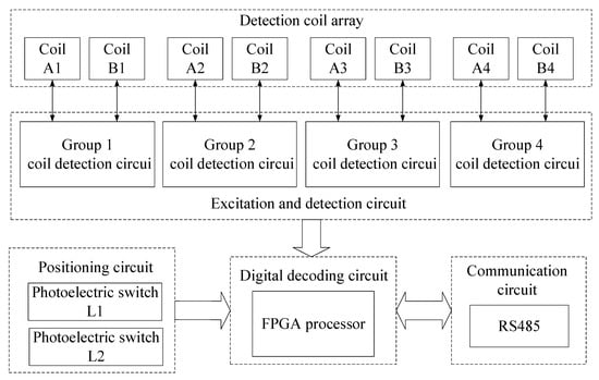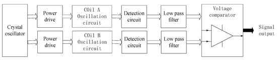 The circuit structure of NINK is shown in Figure 7. The detection coil array of NINK is divided into 4 groups to detect the coding of the corresponding position of the marker plate, respectively. Each group of coils has its own excitation and detection circuits to excite the coils to generate high-frequency vibration and to detect the peak-to-peak voltage of each coil. Figure 8 shows the working flow of the excitation and detection circuits of a group of coils, the oscillating circuits of the two coils share a crystal oscillator to ensure that the two coils work synchronously. The detection and filter links can obtain the peaking value of the coil terminal voltage after removing clutter interference, and feed the two coil voltage values into the voltage comparator, judge the position of the narrow seam of the marker plate by comparing the voltage, and output the corresponding voltage signal. Four groups of coil detection circuits send the voltage comparison results to the FPGA processor for decoding, so as to determine the marker plate code and analyze the current position. Finally, the sensor sends the decoded information to the upper computer through RS485 communication circuit, and the position detection is completed after confirmation by the upper computer. In addition, the filter capacitor is connected to the input terminal of the power module of NINK, and the input/output cables are shielded to suppress EMI interference. The aluminum case also makes the sensor have good electromagnetic compatibility.