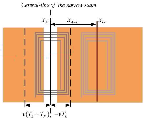 Geometric delay is manifested as positioning error of NINK, which is the deviation between the actual reading position and the standard reading position. The standard reading position is the position when the center line of the detection coil coincides with the center line of the narrow seam, causes the actual read position to be ahead of the standard position, while and mean that the actual read position lags behind the standard position, Figure 9 shows the intuitive expression of the geometric delay. The geometric delay causes the detection coil to deviate from the standard read position, which in turn causes the equivalent inductance and terminal voltage of the coil to change. In order to quantify the impact of speed on code-reading reliability, a speed adaptability index, , is proposed: