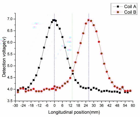 Voltage of detection coil varies with longitudinal position (detection distance is 10 mm).