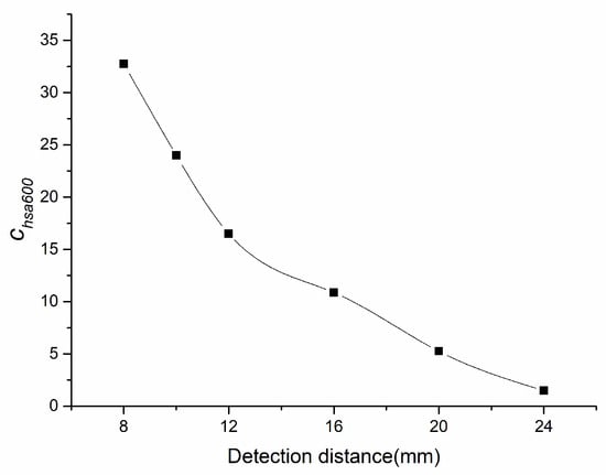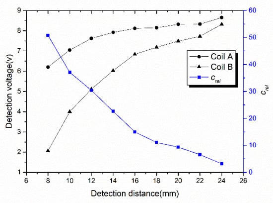 The voltage variation of coils A and B at different detection distances is shown in Figure 12. Since coil A is facing the narrow seam and coil B is facing the complete copper coating, the voltage of coil A is always greater than that of coil B. Large voltage difference is helpful to identify the narrow seam of the marker plate. When the detection distance is 8 mm, the voltage difference is the largest, so the characteristics of the narrow seam can be fully confirmed. The greater the detection distance is, the closer the voltage of the two coils will be, resulting in the decrease of the code-reading reliability index. When the detection distance is 8 mm, the code-reading reliability is as high as 52, while when the detection distance is 24 mm, the code-reading reliability is less than 5. Obviously, reducing the detection distance can increase the voltage difference and thus increase the code-reading reliability. However, the detection distance should be greater than 8 mm in order to avoid collision between the sensor and the marker plate.