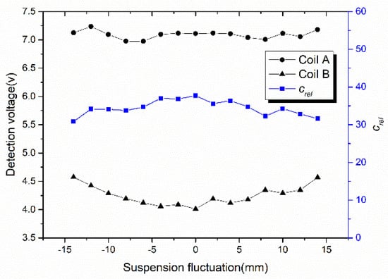Affected by the suspension fluctuation of maglev train, the terminal voltage change of NINK’s detection coils is shown in Figure 13. The voltage of the two coils varies little with the suspension fluctuation, but the voltage difference is always large. The code-reading reliability is all higher than 30, which indicates that the sensor is not significantly affected by the suspension fluctuation of the train.