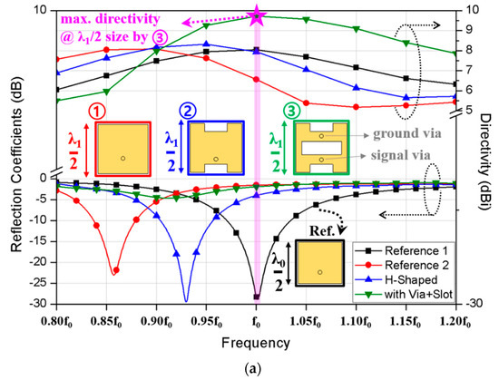 Microstrip patch antenna is usually preferred due to its simple architecture, low-complex design, ease of fabrication and integration with ICs, and good performance [16,17]. The conventional patch antenna is designed by a half wavelength at its operation frequency as shown by the reference 1 antenna in Figure 1a. Here, 3-D simulation extracted data by CST studio suite software are used to present the plots. The reference 1 antenna operates at f0 denoting a desired target operation frequency. It is known that the maximum achievable gain of antenna theoretically depends on its physical size compared to the wavelength at an operation frequency. However, if the antenna size is simply enlarged to λ1/2 to increase the potential gain, the operation frequency lowers due to the increase in wavelength without a gain enhancement at the center frequency. That is, although the increase in antenna size can increase the potential gain or directivity, the shift in matched frequency is unavoidable due to the change in a wavelength.