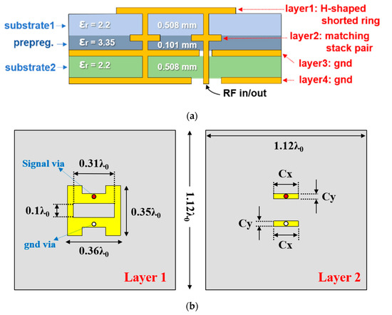 Figure 2 shows the proposed H-shaped shorted ring with a pair of vertically loaded conductor stacks along the signal feed and shorting pin. The proposed structure is designed with 4-layers using two substrates and a single prepreg as shown in Figure 2a. The slot-loaded patch with a shorting pin is designed on layer 1 and additional matching stack is inserted into layer 2. The matching stack consists of a pair of rectangular conductors where one is loaded on the signal feed line and the other is connected to the ground. Figure 2b shows the dimension and matching stack parameters.