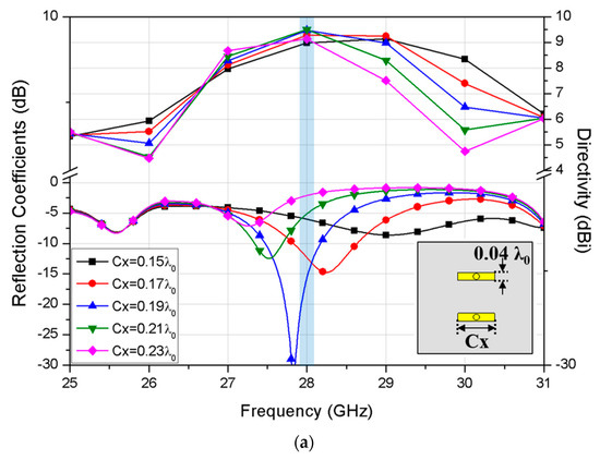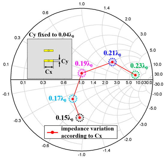 Depending on the values of Cx and Cy, loaded inductance and capacitance are varied. Since the increase in Cy heavily loads the capacitance on the antenna, Cy value is minimized to the size corresponding to the through-via size. Having the Cy fixed to 0.04 λ0, the effect of variation in Cx value on the antenna impedance is simulated as shown in Figure 3. Starting from the arbitrary chosen value of 0.15 λ0, the increase in Cx shows the additional inductive and capacitive loading that makes the impedance match to the operation frequency by Cx of 0.19 λ0. Here, the λ0 at 28 GHz corresponds about 10.7 mm and the Figure 3 represents the parameter variation according to 0.2 mm in length. Since the typical printed circuit board (PCB) technology where a fabrication resolution of 0.1 mm can be guaranteed, the concern about fabrication sensitivity of the proposed architecture can be negligible.