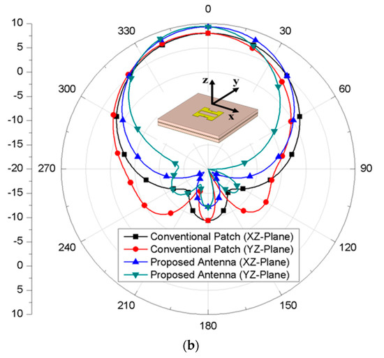 Further, the effect of variation in Cx value on the achievable directivity is also simulated as shown in Figure 4a. Having the Cx and Cy set to 0.19 λ0 and 0.04 λ0, respectively, it confirms that simultaneous matching for reflection coefficient and maximum directivity were achieved at the target frequency of 28 GHz. Then, radiation pattern of the proposed antenna is simulated and compared with the conventional patch antenna with the same ground size as shown in Figure 4b.
