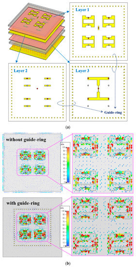 To validate the effective use in a practical array configuration, the proposed antenna structure is extended to the 2 × 2 array as shown in Figure 5a. The same substrates and prepreg materials as described in Figure 2a are used and the four slot-loaded radiation elements with shorting pins are integrated on the top layer. Also, each antenna element is vertically loaded with a pair matching stack as shown in layer 2 while the 1 × 4 feed network is integrated into the layer 3 to excite the four radiation elements with a single RF port. Further, an additional guide-ring of 1.55 λ0 × 1.54 λ0 as a magnetic wall is integrated with the proposed array antenna. Since mmWave antennas are relatively small compared to RF connectors used for measurement, a large ground plane is usually required to fabricate the mmWave antenna sample. However, the large ground plane causes the unnecessary spread of RF currents, resulting in a shift of matching frequency or gain degradation. Further, in the array structure, a phase mismatch in surface current of each radiation element occurs without the guide-ring as shown in Figure 5b. The upper two elements and lower two elements have different current distribution due to the phase mismatch. Thus, by integrating the guide-ring to prevent the RF current from spreading and keeping the surface currents among each element uniformly excited, the antenna gain can be further optimized.