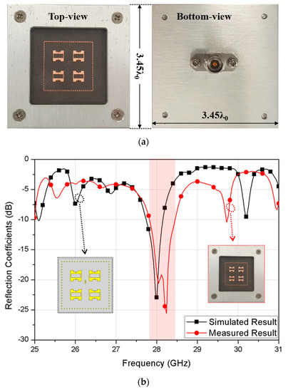 Implementation of the proposed 2 × 2 array antenna with (a) fabrication photo and (b) simulated and measured reflection coefficients.