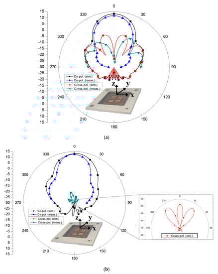The fabricated volume of the fabricated antenna was 3.45 λ0 × 3.45 λ0 × 0.17 λ0 at 28 GHz including the whole ground plane size while the guide-ring area occupied about 1.55 λ0 × 1.54 λ0. The simulated and measured 10-dB impedance bandwidth of the proposed 2 × 2 array antenna were 1.43% and 2.29%, respectively. Here, the measured bandwidth was slightly increased possibly due to the effect of the test jig required for fixing the RF connector firmly. Having the proper fixture is critical in mmWave antenna measurement since it provides consistent measured results. Thus, the measured result is reasonable in comparison with the simulated result. Finally, the simulated and measured radiation patterns of the proposed antenna at 28 GHz are shown in Figure 7a,b. The simulated and measured peak gains were 13.2 dBi and 12.5 dBi, respectively, including the 1 × 4 feed loss. We noted that the decreased gain is suspected due to the antenna test jig. This result also implies that the increased bandwidth is the result of more loss added to the return loss. Further, the measured HPBWs in xz and yz planes of the proposed antenna were about 34° and 31°, respectively, while the simulated HPBWs were about 36° and 37°, respectively. The measured minimum cross-polarization discrimination (XPD) level showed more than 15.5 dB. Therefore, the feasibility of the proposed mmWave antenna structure was verified by the good agreement between the simulated and measured results at 28 GHz. Lastly, the performance comparison with the other antenna topologies is summarized in Table 1.
