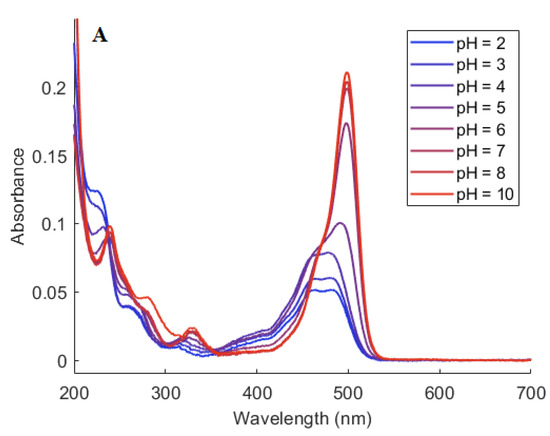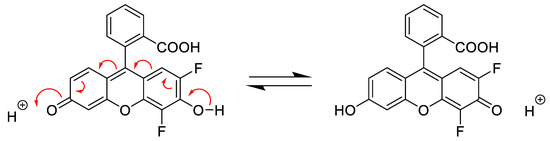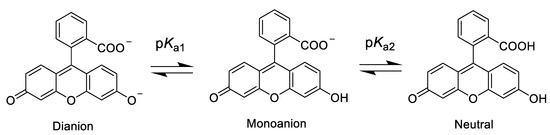 Xanthene-based molecules such as fluorescein have a feature that influences their use as a fluorescent probe: pH-dependent protonation/deprotonation alters properties of the molecule. In this way, for example, the extent of aggregation and intermolecular binding [8,9], the magnitude of the fluorescence quantum yield [10,11,12,13], and the yield of photosensitized O2(a1Δg) production [12,14] all depend on whether the molecule is in its dianion, monoanion, or neutral form (Figure 1). Although more complicated schemes can be presented to illustrate the pH-dependent structures of fluoresceins [15,16], the equilibria shown in Figure 1 are sufficient for our current discussion.