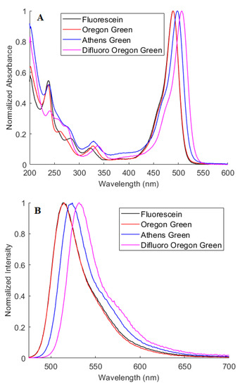 Our results show that fluorination generally results in a bathochromic shift of the band maximum in both the absorption and emission spectra (Figure 4 and Table 1). This observation is consistent with data published on related compounds [20]. Most interestingly, however, the spectra of the symmetrical 2′,7′-difluoro compound (i.e., Oregon Green) are not appreciably different from those of fluorine-free fluorescein, whereas the spectra of the non-symmetrical 2′,4′-difluoro derivative (i.e., Athens Green) are noticeably red-shifted by ~10 nm. Fluorination in all four positions to form 4′,5′-difluoro Oregon Green results in a further red-shift of ~10 nm.