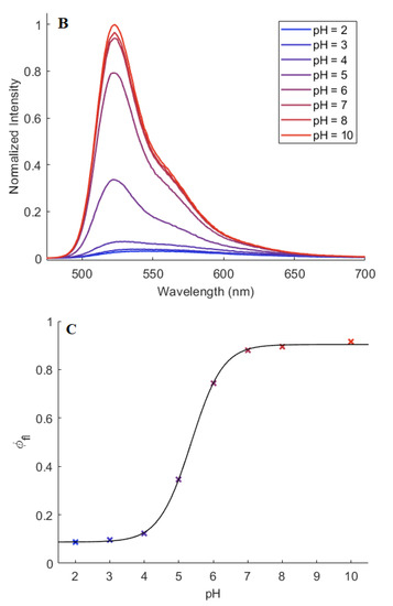 - Martin, M.M.; Lindqvist, L. The pH dependence of fluorescein fluorescence. J. Lumin. 1975, 10, 381–390. [Google Scholar] [CrossRef]