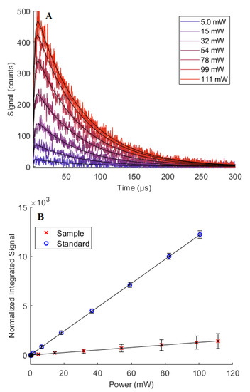 (A) Representative time-resolved O2(a1Δg) → O2(X3Σg−) phosphorescence traces recorded at 1275 nm upon 420 nm pulsed laser irradiation of Athens Green in air-saturated D2O at pD = 5.0. For the triplet state photosensitized production of O2(a1Δg) in water, where the concentration of oxygen is comparatively low, it is common to discern a rise in the time-resolved signal corresponding to the comparatively slow rate of O2(a1Δg) production. Such data are quantified using a difference of two exponential functions [27,39], and this fitting function is superimposed on each kinetic trace. (B) The integrated signal amplitude, normalized by the O2(a1Δg) lifetime, τΔ, and the sample absorbance, plotted as a function of the incident laser power. The slopes of the linear fits are proportional to φΔ.