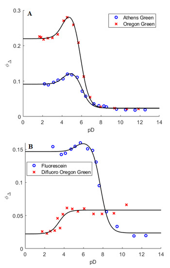 At any given pD, the measured value of the O2(a1Δg) quantum yield, φ∆meas, will reflect contributions from the dianionic (da), the monoanionic (ma), and the neutral (n) species, and we can model the pD-dependence of φ∆meas shown in Figure 7 with the function in Equation (1).