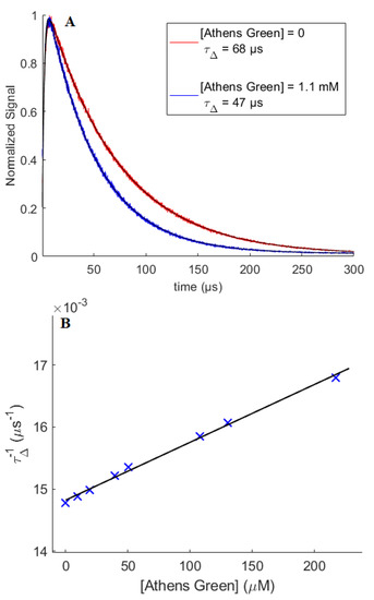 (A) Representative time-resolved 1275 nm O2(a1Δg) phosphorescence traces recorded upon 670 nm pulsed laser irradiation of AlPcS4 in air-saturated D2O-PBS at pD = 7.8 in the presence of Athens Green, the concentration of which is shown in the legend. (B) The inverse lifetime of O2(a1Δg), τΔ−1, plotted as a function of the concentration of Athens Green, obtained from experiments such as those shown inFigure 8A. The solid black line is a linear fit to the data, the slope of which yields ktotal. The size of the symbols in Figure 8B represent the errors on each data point.