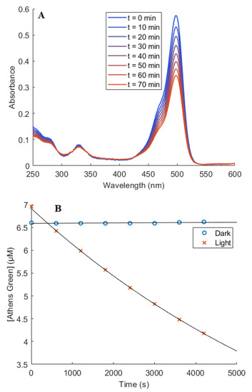 (A) Absorption spectra of Athens Green in D2O-PBS (pD 7.8) recorded as a function of the elapsed irradiation time of the O2(a1Δg) sensitizer AlPcS4 at 670 nm. The absorption spectrum of AlPcS4 does not change under these conditions and was subtracted to yield the data shown. (B) The concentration of Athens Green as a function of AlPcS4 irradiation time (crosses). An independent sample, kept in the dark and monitored at identical intervals, did not show detectable absorption changes. The solid lines are fits to the pertinent kinetic rate equations for reactions with O2(a1Δg) [45]. The size of the symbols in Figure 9B represent the errors on each data point.
