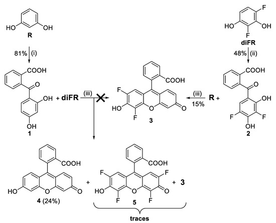 As shown in Scheme 1, we approached the synthesis of the non-symmetric difluoro derivative through two independent stepwise Friedel–Crafts reactions of resorcinol (R), 2,4-difluororesorcinol (diFR), and phthalic anhydride (PA). We prepared diFR in four steps from 2,3,4,5-tetrafluoronitrobenzene [14].