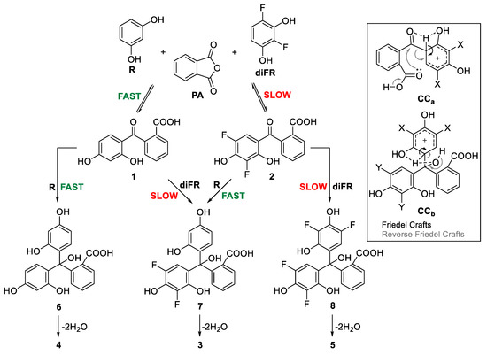We propose the mechanism shown in Scheme 2, which can rationalize why the reaction of ketone 1 with diFR principally produces fluorescein 4, while the reaction of ketone 2 and R affords mainly difluorinated fluorescein 3 (i.e., Athens Green). It is first important to recognize that, because we work under acidic conditions, we should consider all reactions shown in Scheme 2 as equilibria (i.e., Friedel-Crafts and reverse Friedel-Crafts reactions). Thus, for example, in the reaction of ketone 1 and diFR, formation of the Friedel-Crafts product 7 will compete with the formation of R and PA via a reverse Friedel-Crafts reaction. In both the Friedel-Crafts and reverse Friedel-Crafts reactions, similar arenium carbocation intermediates are formed (CCa and CCb in Scheme 2), either from the nucleophilic attack of the aromatic ring on a carbonyl carbon or a proton. These carbocations may be deprotonated (Friedel-Crafts) or decarbonylated (reverse Friedel-Crafts). When substituted with the electronegative fluorine atoms (X = F in Scheme 2), the carbocations are less stable. As such, if arenium carbocation formation is the rate-determining step of both the Friedel-Crafts and the reverse Friedel-Crafts reactions, as expected for a typical electrophilic aromatic substitution reaction [26], any reaction involving diFR, either as reactant (Friedel-Crafts) or product (reverse Friedel-Crafts) should be less favorable and, thus, slower. Therefore, the reaction of 2 with R is the best way to obtain the non-symmetrical difluoride 3 (i.e., Athens Green).