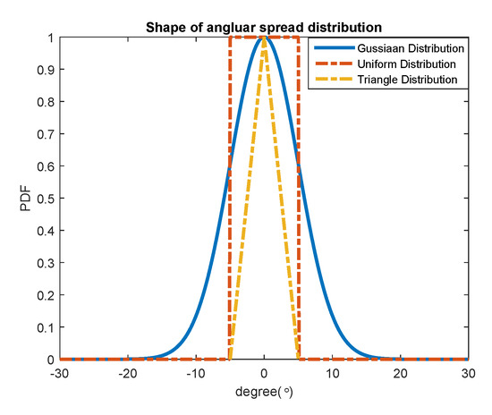where is the vector containing the entry . ⨀ is the Hadamard–Schur matrix. These three classic shapes of the angular spread distribution are shown in Figure 2.
