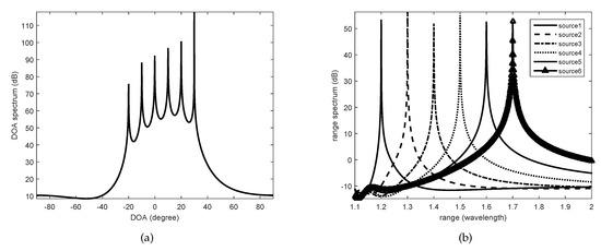 In the first experiment, we considered six BPSK sources. Their position information relative to the reference element was as follows: , , , , , and . In addition, they all obeyed the Gaussian distribution, and the corresponding spatially distributed parameters were , , , , , and , respectively. The SNR was set as 15 dB. The DOA and range spectra are shown in Figure 3. It can be seen that in the spectrum of the DOA, six peaks can be clearly identified. With the angle information that we have obtained, we can see six corresponding distance spectrum peaks in turn.