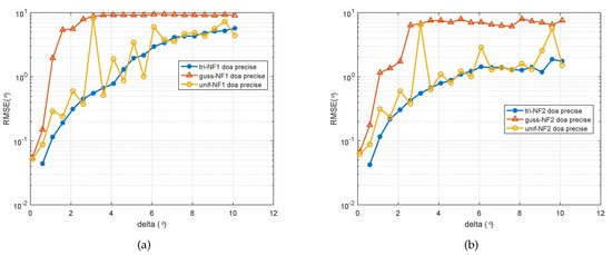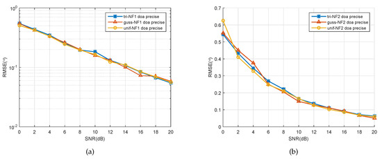 In the second scenario, we considered two sources following one of the distributions (Gaussian, uniform, or triangle) from and that impinge on a five-element ULA, of whose spatially distributed parameters’ are and , respectively. The number of snapshots was set to 200, and the SNR varied from 0 to 20 dB in a step-size of 2 dB. It is clear that the accuracy of the DOA estimates of the first spatially distributed signal increased with the growth of SNR, as shown in Figure 4a. For the second spatially distributed signal estimation, the results indicated a similar conclusion, as seen in Figure 4b. At the same time, we can still see a small difference between the two sources with three kinds of PDF, that is, a steady decline in the estimation errors of the second distributed signal with the growth of SNRs. This is because that the estimation accuracy is reliant upon the spatial distribution parameter ∇, which will be further verified in following simulations.