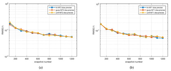 In the third simulation, the relationship of the parameter estimation accuracy with the snapshot number was studied. We considered distributed signals from and impinging on a five-element ULA, whose spatially distributed parameters’ were and , respectively. The SNR was set to 15 dB, and the number of snapshots varied from 100 to 1200 in a step-size of 100. As seen in Figure 5a, the RMSEs of the DOA estimates descended in a steady trend with the increase of the number of snapshots. The results indicated a similar conclusion for the second source, as seen in Figure 5b.