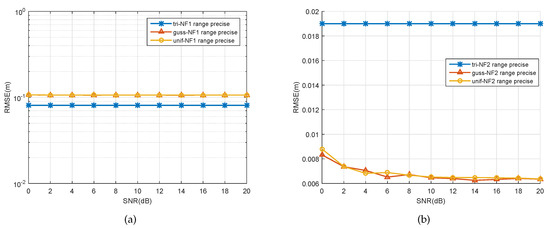 As can be seen from (35), the angle and range can be automatically paired without any other operation. Additionally, it can be seen that the maximum number of sources that can be estimated by this algorithm is . Compared to traditional second-order statistics algorithms, the identification capability of the proposed method has been doubled. In addition, the estimation accuracy of the proposed algorithm is also greatly improved, which will be verified through the following simulations.