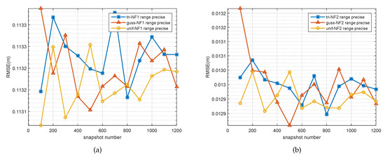 RMSE of the range estimates of two signals versus snapshot. (a) First spatially distributed source with three kinds of PDF, (b) second spatially distributed source with three kinds of PDF.