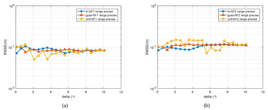 RMSE of the range estimates of two signals versus parameter ∇. (a) First spatially distributed source with three types of PDF, (b) second spatially distributed source with three types of PDF.