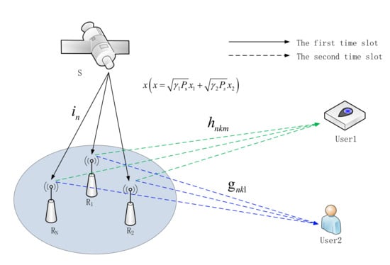 A complete satellite downlink communication process includes two time slots. In the first time slot, the satellite s sends the superimposed signal to the relays, and the signal received by the relay node n can be written as: