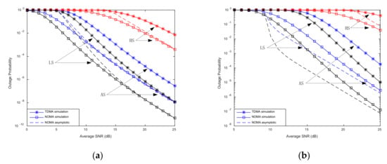 Figure 2 plots the outage probability for NOMA and TDMA under different shadowed Rician fading. Observing Figure 2, we can conclude that compared to TDMA, the proposed scheme can realize better outage probability. As the communication link transitions from HS to LS, the outage performance of User 1 and User 2 continues to improve. We can also find that the increase in outage probability between HS and AS is much greater than between AS and LS. The main reason for this phenomenon is that has increased by 930 times and 2 times, respectively. The substantial increase in the received power significantly improves outage performance.