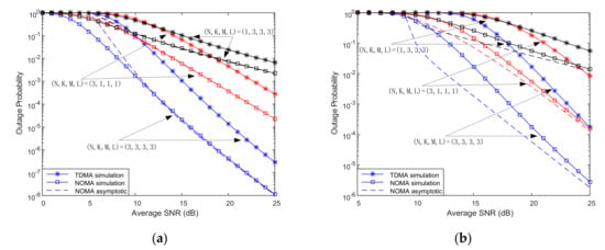 In Table 1, we make a comparison between NOMA and TDMA schemes on the outage probability. It can be found that NOMA achieves better outage performance than that of TDMA. Through longitudinal comparison, the outage performance of users only improves 3 times when we set (N,K,M,L = 1,3,3,3). Under other conditions, the outage performance of users is increased by more than 10 times. Especially when R1 = 0.6 bit/s/Hz, the outage performance of User 2 is increased by 500 times. When the user adopts the TDMA scheme, each time slot can only serve one user. In order to complete the same transmission task per unit time, the user’s transmission rate in each time slot is doubled. The increase in the transmission rate leads to an increase in the corresponding threshold. Under the condition of total power limitation, the outage performance of users will decrease. At the same time, in the CR-NOMA solution, User 2 can make full use of the remaining power after ensuring that User 1 is not interrupted, which also greatly improves User 2’s outage performance.