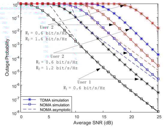 In Figure 4, we respectively show how the user’s target rate affects the outage probability of cooperative NOMA and cooperative OMA. It can be seen from the Figure that the outage probability of users based on NOMA is always better than that of TDMA. When the target rate of User 1 is small and fixed, its outage probability will not change with the change of the target rate of User 2. As the target rate of User 2 continues to increase, its outage performance under TDMA declines far greater than NOMA. The main reason is that the communication threshold of User 2 under TDMA increases with the increase in communication rate far greater than that of NOMA. At the same time, the system energy utilization rate of User 2 under TDMA is lower than that of NOMA.