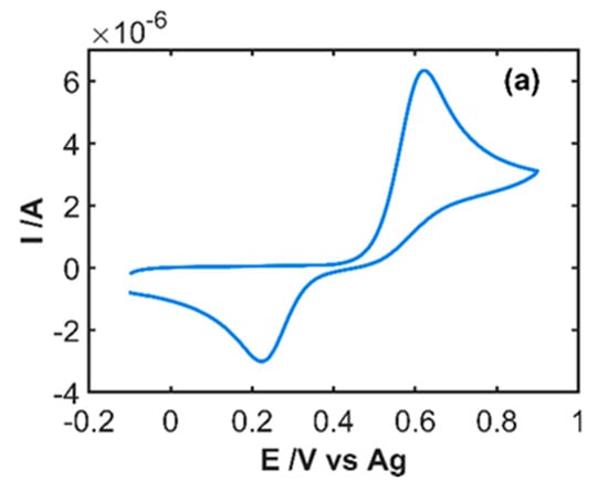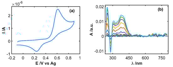 The first step carried out in this work was the study of the electrochemical oxidation process of IP, registering simultaneously the cyclic voltammogram and all spectral changes in the UV/Vis spectral region. Figure 2a shows the cyclic voltammogram of a solution 5 × 10−4 M IP in 0.1 M HCl recorded between −0.10 and +0.90 V at 0.01 Vs−1. A quasi-reversible electron transfer process is observed where an anodic peak emerges at +0.62 V and a cathodic peak at +0.22 V.