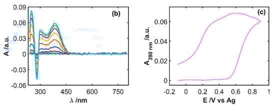 Spectroelectrochemistry (SEC) experiment of 5 × 10−4 M IP in 0.1 M HCl between −0.10 and +0.90 V at 0.01 Vs−1. (a) Cyclic voltammogram, (b) spectra evolution during the anodic scan, and (c) cyclic voltabsorptogram at 390 nm.