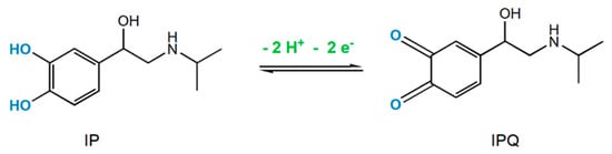 As other catecholamines, in the forward scan IP is oxidized in acid medium to the corresponding quinone, known as isoproteroquinone (IPQ), in a process that involves the transfer of two protons and two electrons (Figure 3) [7,17]. Subsequently, in the backward scan, electrogenerated IPQ is reduced to IP.