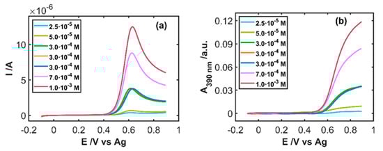 Once the behavior of IP was explained, a set of UV/Vis absorption SEC experiments were carried out to evaluate the correlation of these signals with the concentration of IP. Therefore, a set of nine calibration samples with different concentrations of IP between 5 × 10−6 and 1 × 10−3 M in HCl 0.1 M were measured. Linear sweep voltammograms were recorded between −0.10 and +0.90 V at 0.01 Vs−1 and, concomitantly, full absorption spectra were registered every 500 ms. Figure 4a shows the linear sweep voltammograms and Figure 4b the linear voltabsorptograms at 390 nm for some selected concentrations. As expected, an increase of the anodic peak current with the concentration is observed, as well as an increase of the absorbance values at this wavelength from +0.50 V onwards.
